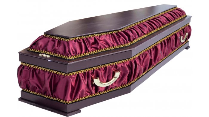 В таких конструкциях удачно сочетаются деревянные элементы с поверхностями, драпированными обивкой из ткани. Полированная крышка выполняется в двух вариантах: с распятием и без. В наличии есть разные модели от 13000 рублей